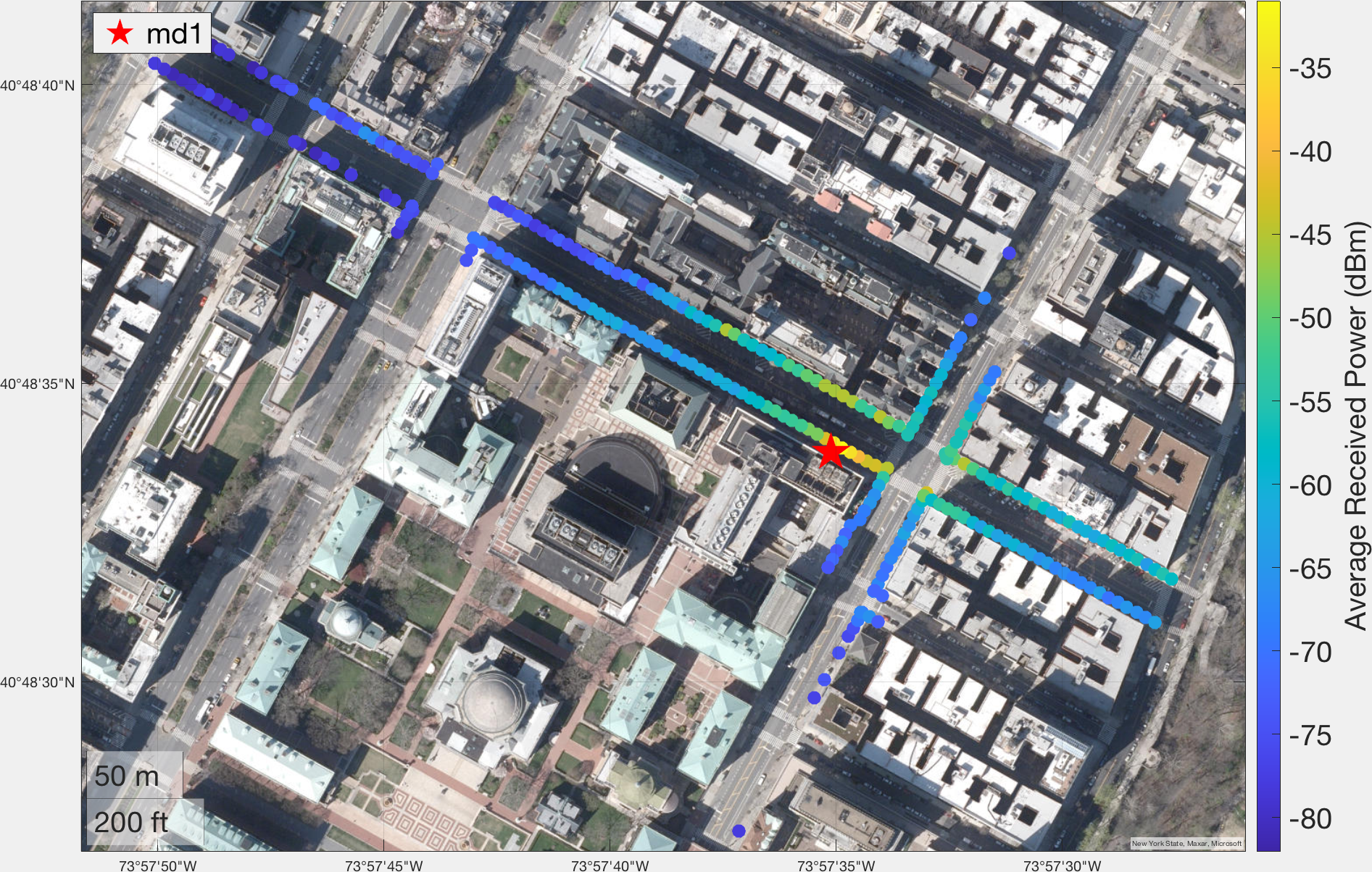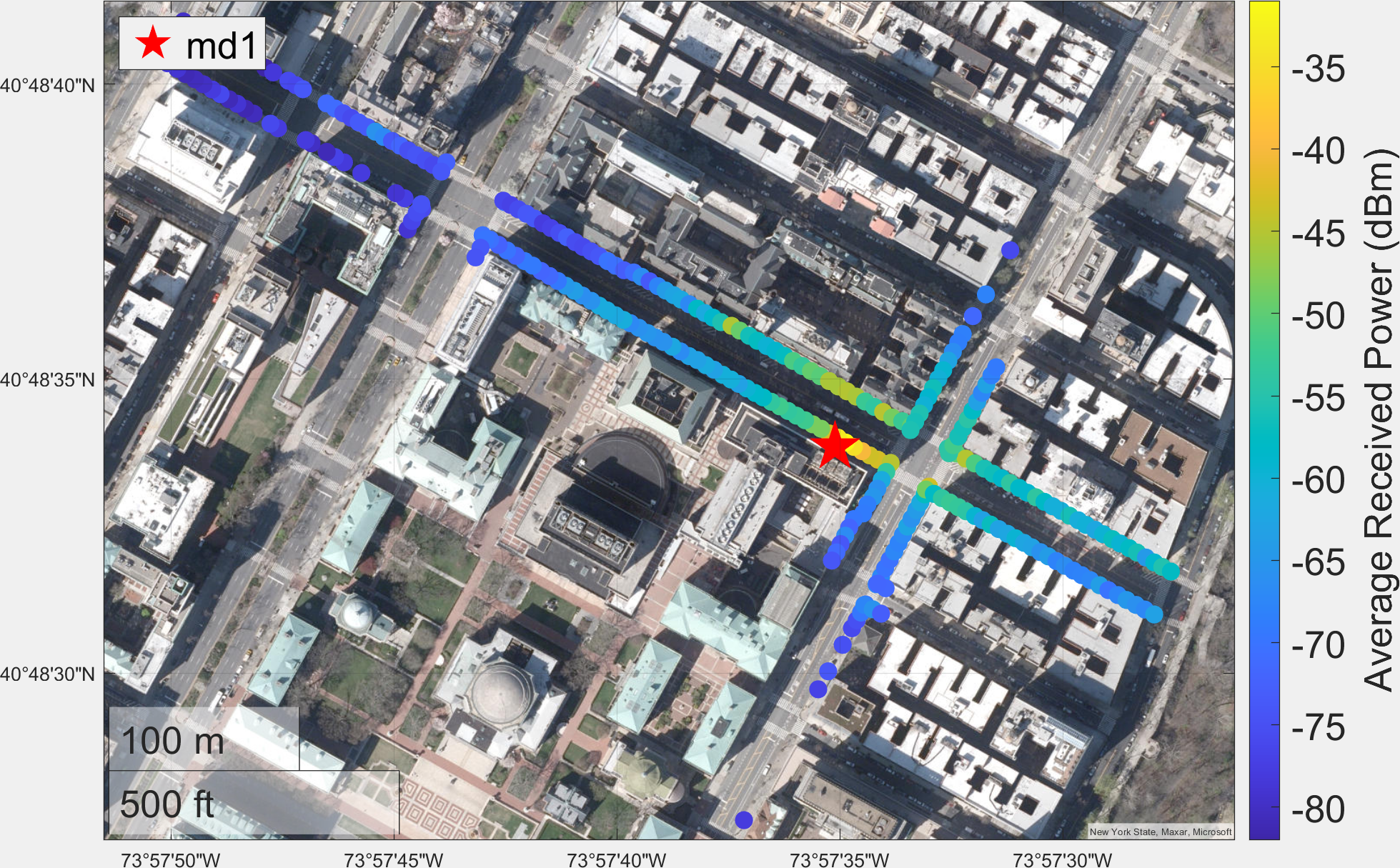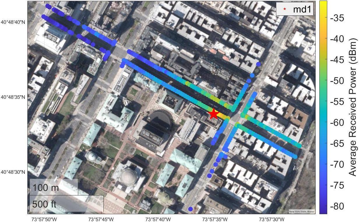 Coverage measurements were performed in the area around md1 in February and March 2022. In total, around 100 measurements have been taken on sidewalks in the area spaced by roughly 5m. The measurement results are presented below.