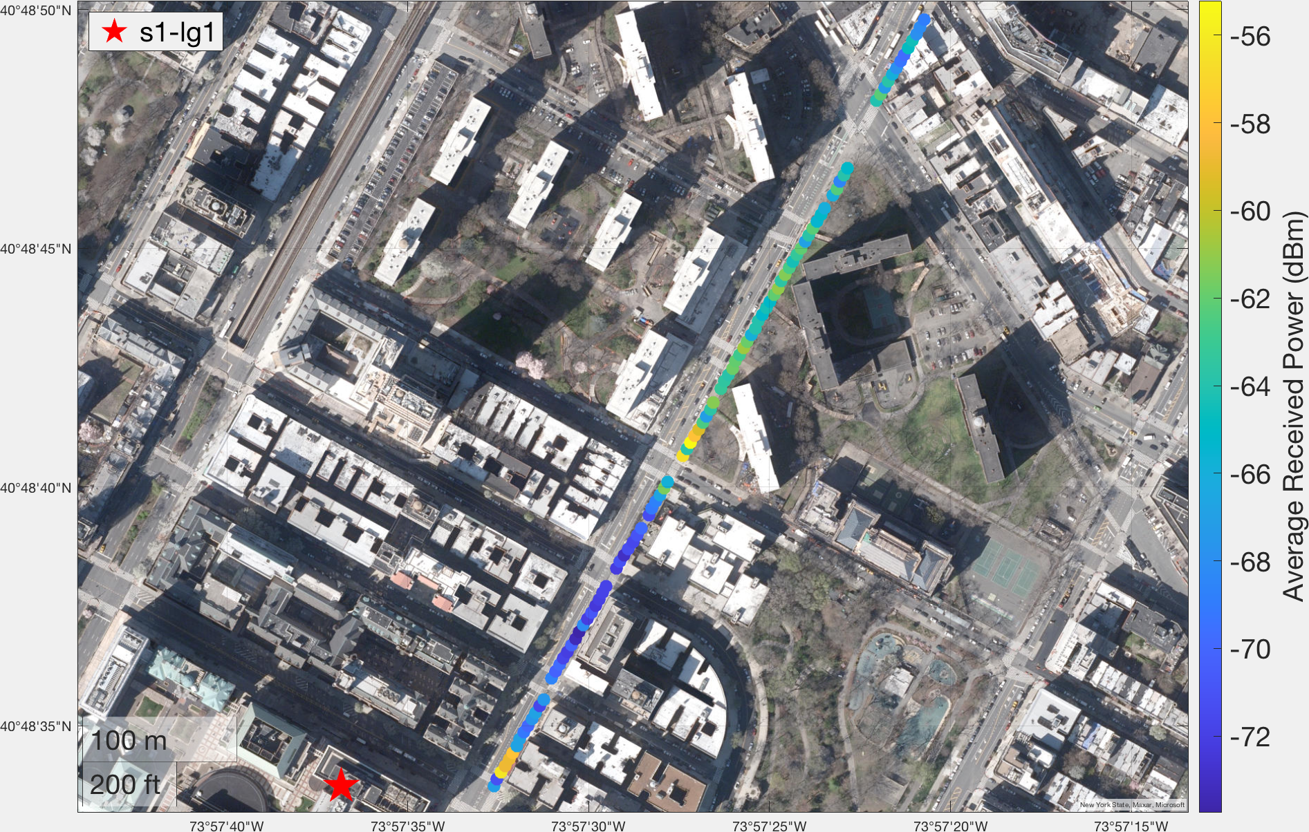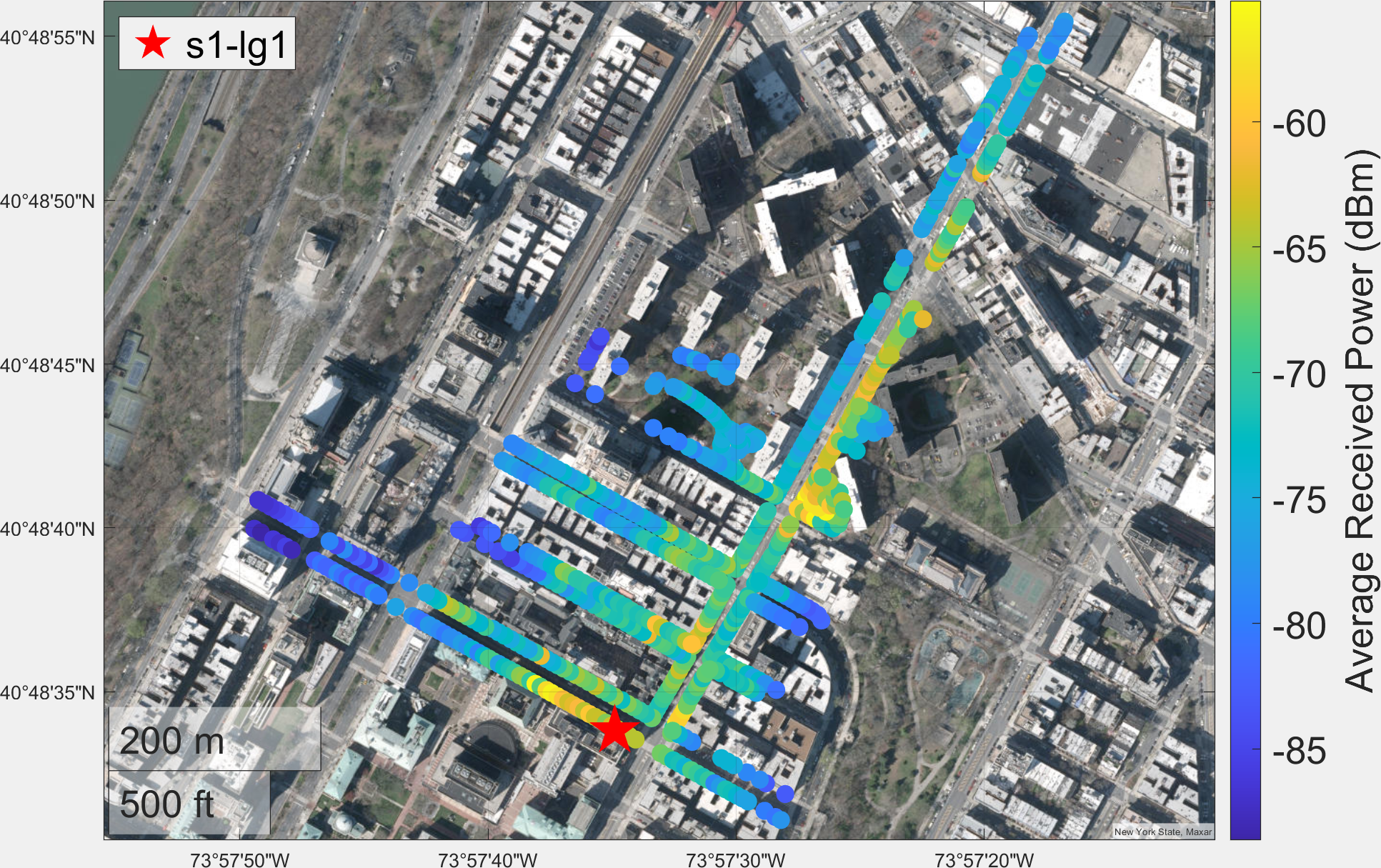 The measurements show coverage upto half way between 129th and 130th street along Amsterdam avenue, receiving over -80 dBm RSSI. Coverage also ranges upto Riverside Drive along 120th street with around -85 dBm RSSI.