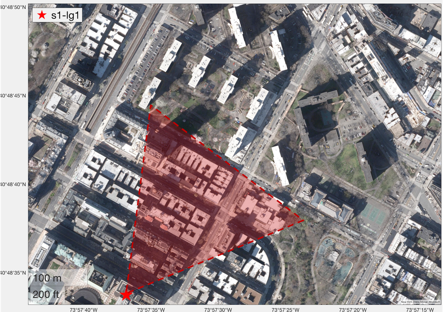 Node s1-lg1 is the first sector of Large Node 1, located on the 18th floor roof of the Mudd Building at Columbia University, roughly 68m above the campus level and 78m above the street level. Sector 1's antenna is pointed to the northeast overlooking Amsterdam Ave.