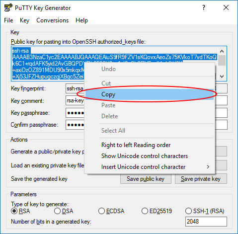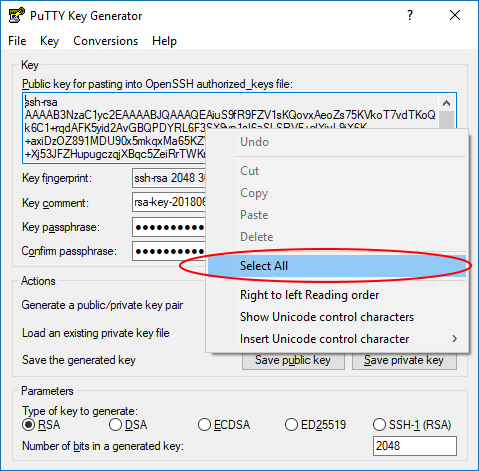 - After saving the private key file, right-click in the big text box labeled "Public key for pasting into OpenSSH authorized_keys file" and click "Select All" from the popup menu to highlight the entire public key