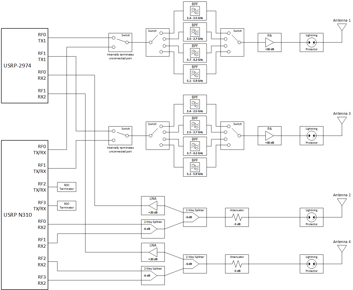 There are 2 receive (RX) chains connected to the USRPs at all times. No filtering is done on the RX chains, so any frequency can be monitored provided it is within the specifications of other system components (900 Mhz – 6 GHz for large node sector, 1.7-6 GHz for medium node). Only the connections to the USRP 2974 have low-noise amplifiers (LNA) connected due to the low maximum input power raing (-15 dBm) of the USRP N310 receive chains and the close proximity of the TX and RX antennas. All the RX2 ports of the USRPs are connected to the receive antennas as follows: