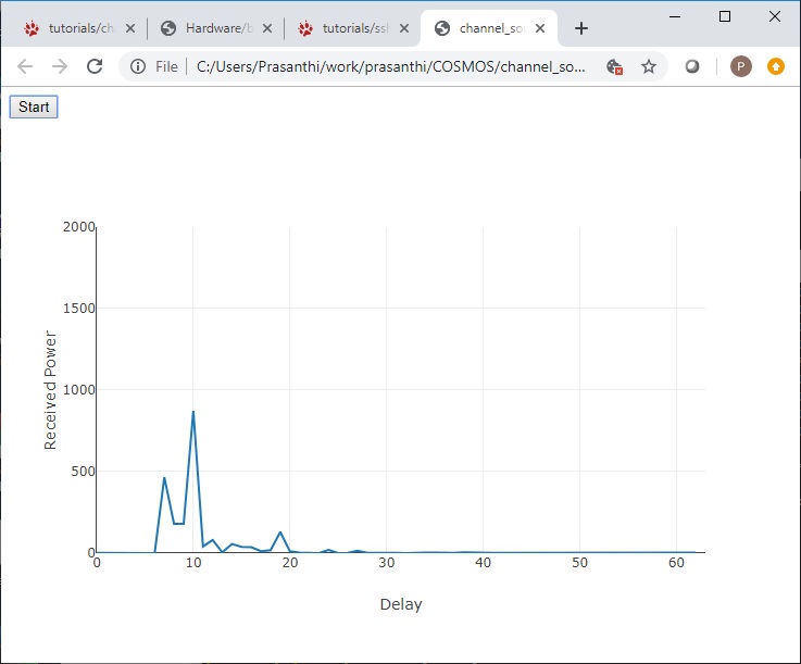 - Download channel_sounding_display.html attached to this tutorial and open it in your browser. Once you click the start button, you should see PDP of the channel.