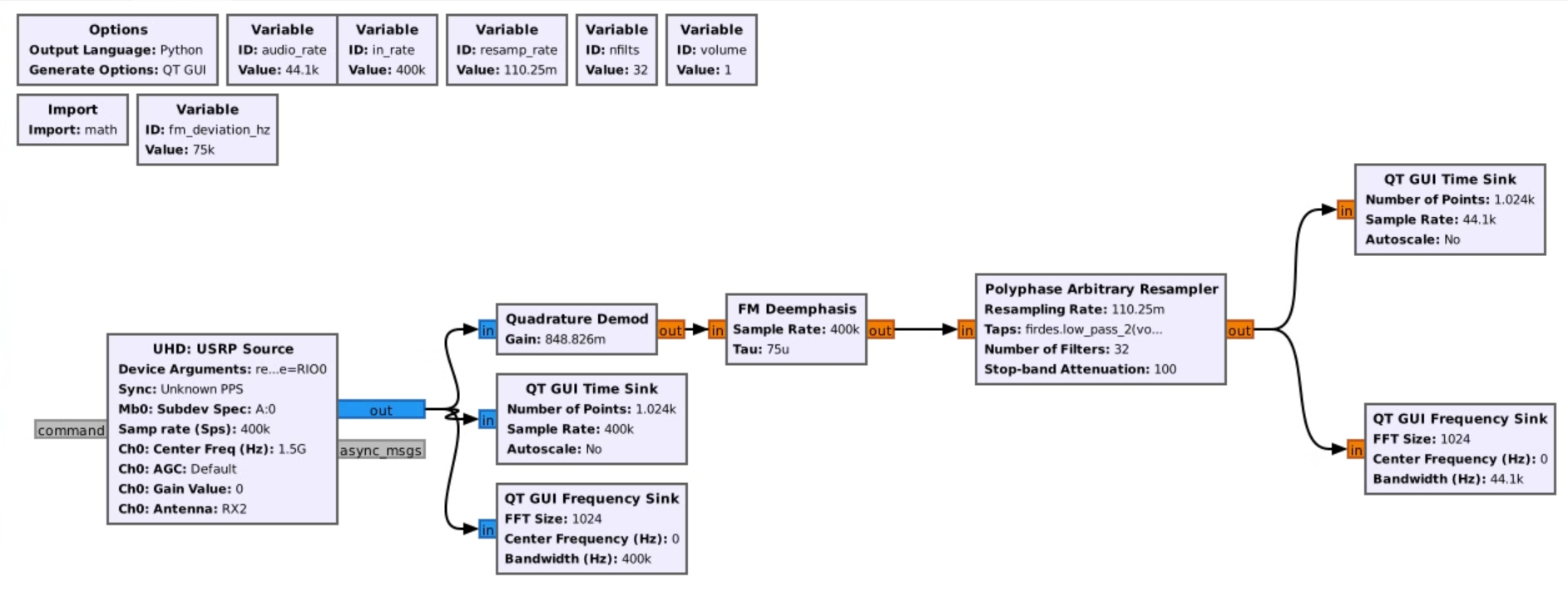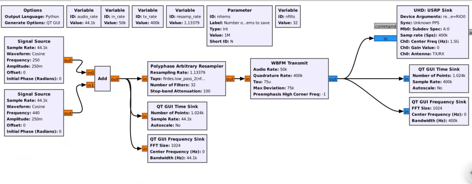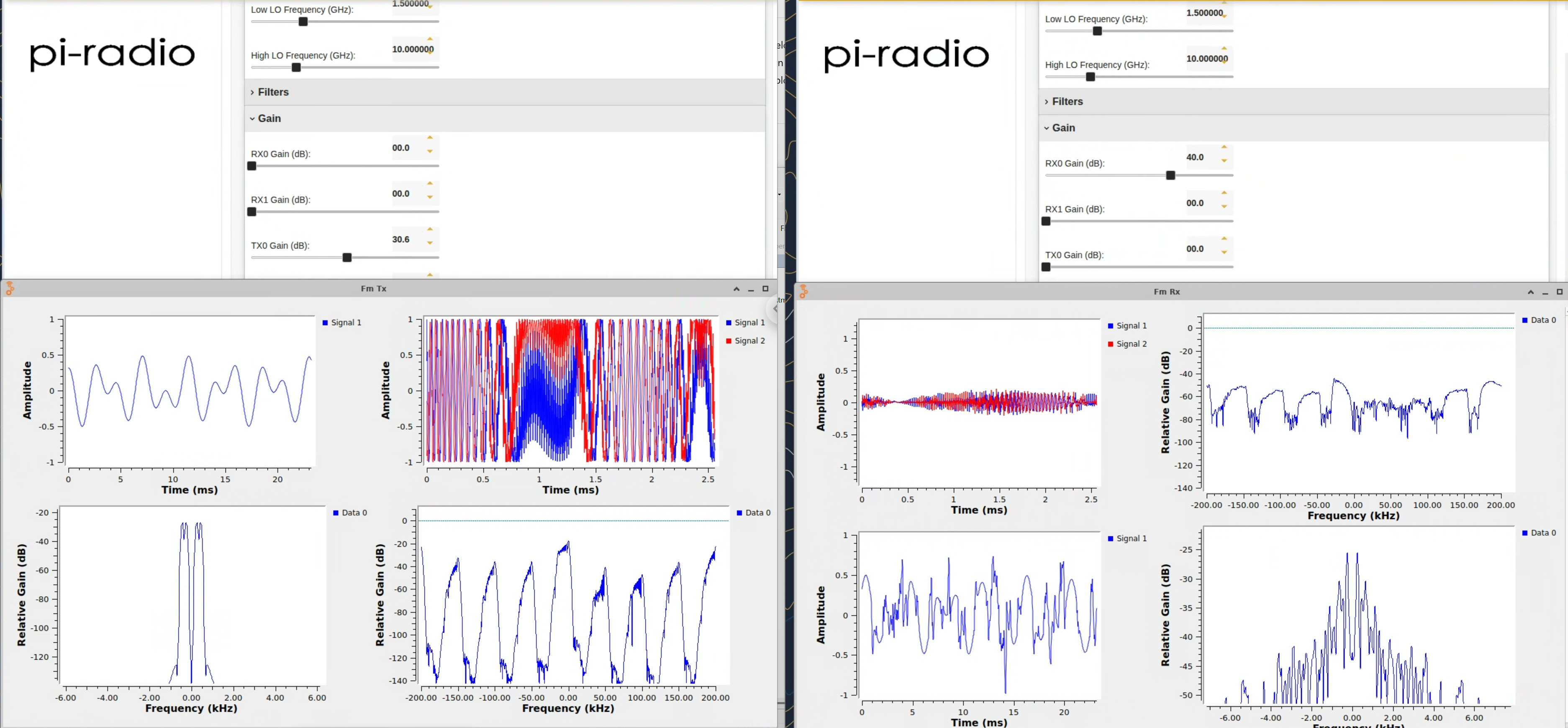 This experiment transmits an analog FM signal over the FR3 bands. The FM signal is generated at 1.5 GHz by the USRP-2974 (Krypton), up-converted by a Pi-Radio FR3 front-end and transmitted,in this example, at 10 GHz). A second Pi-Radio front-end down-converts this signal back to 1.5 GHz for a USRP-2974 receiver, that converts it back into analog baseband. The actual modulation and demodulations is done with a GNURadio running on 2974s. Pi-Radio web UI is used to configure the FR3 conversion.