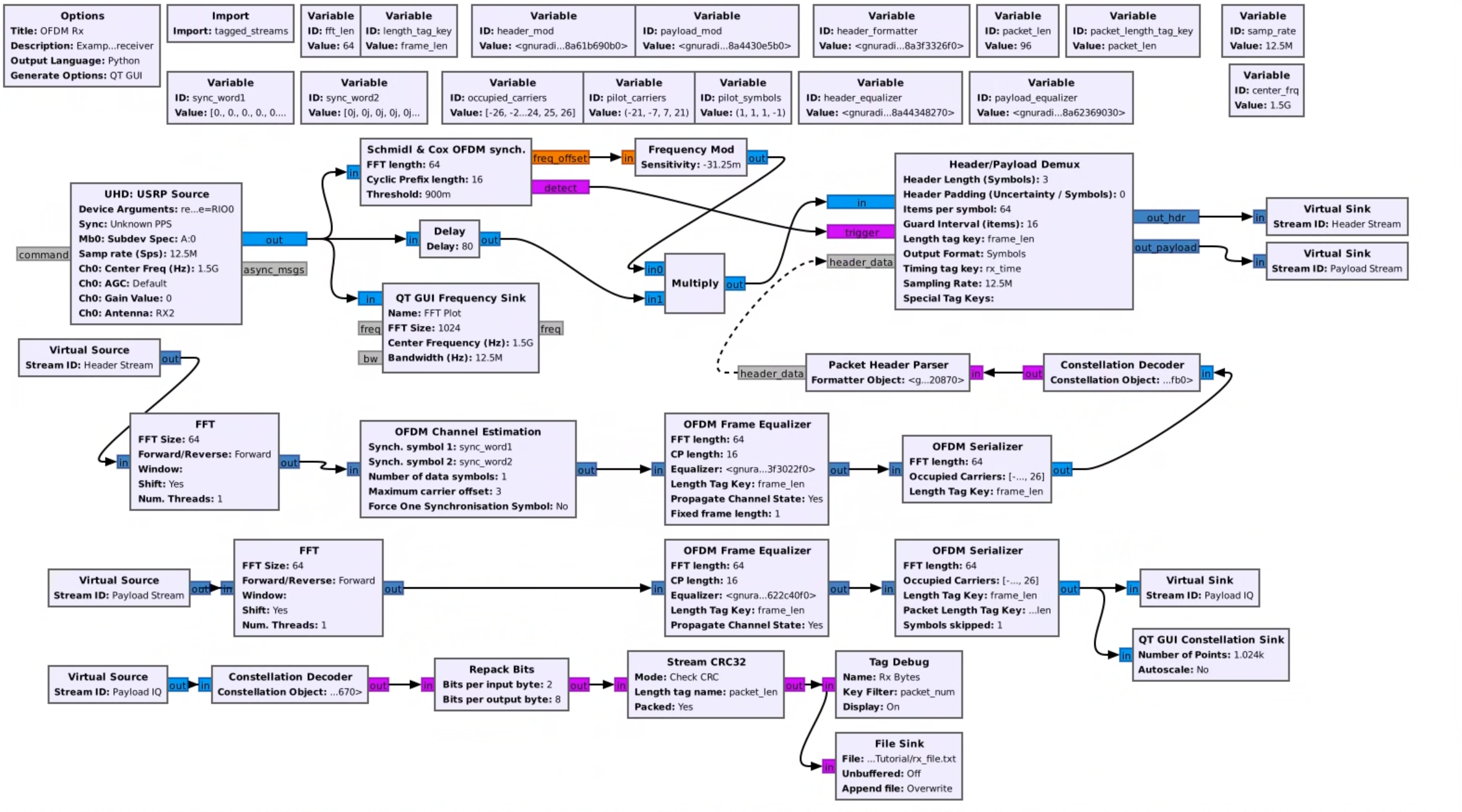 That will bring up the GNURadio companion with OFDM receiver block diagram. Make sure to configure it to use the internal X310 (RIO device).
