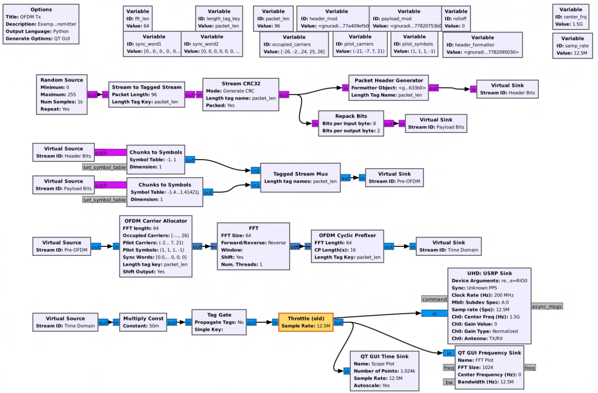 That will bring up the GNURadio companion with OFDM transmitter block diagram. Make sure to configure it to use the internal X310 (RIO device).