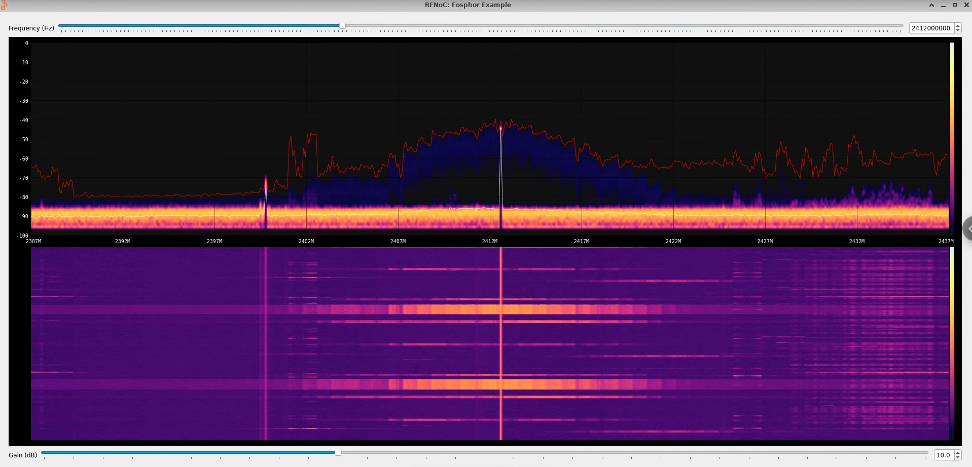This tutorial illustrates use of RFNoC Fosphor block for spectrum visualization. RFNoC Fosphor block is the FPGA accelerated version of gr-fosphor (CPU/GPU version). As any other RFNoC blocks, RFNoC Fosphor can be instantiated on 3rd generation USRP devices, and can be used in conjunction with gnuradio-companion(GRC) on the host computer. This tutorial demonstrates GRC RFNoC Fosphor application on USRP-2974 in COSMOS testbed.