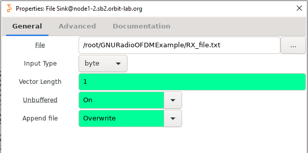 - Open OFDM receiver on node1-2. With X11 forwarding enabled, GRC should show up as below.