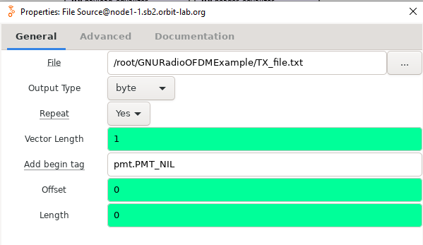 root@node1-1:~# cd GNURadioOFDMExample/ root@node1-1:~/GNURadioOFDMExample# gnuradio-companion TX_OFDM.grc <<< Welcome to GNU Radio Companion 3.9.8.0 >>> Block paths: /usr/local/share/gnuradio/grc/blocks Loading: "/root/GNURadioOFDMExample/TX_OFDM.grc" >>> Done |