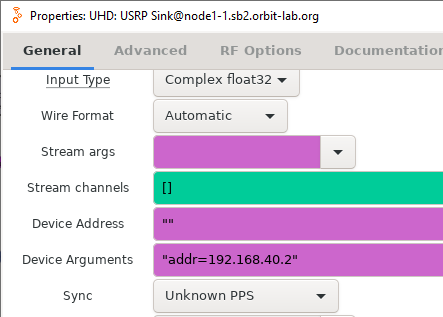 - Make sure the device arguments on both nodes are correctly set as shown below. Check the center frequencies and sample rates, and make sure they match. TX_OFDM.grc has a "File Source" block which reads the text file to be transmitted. RX_OFDM.grc stores the received data in a local file that is specified in the "File Sink" block. Tag Debug block in RX_OFDM_GUI.grc has a Display option, which can be set to 'on', to log various tags used in the flowgraph (Please note that displaying the tags may generate a huge amount of output causing the system to hang. It is advised to turn the display on and collect the output into a file while running in non-GUI mode as shown in the next step)