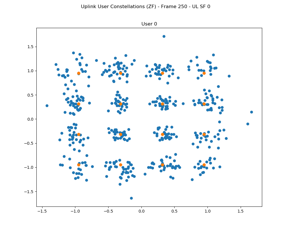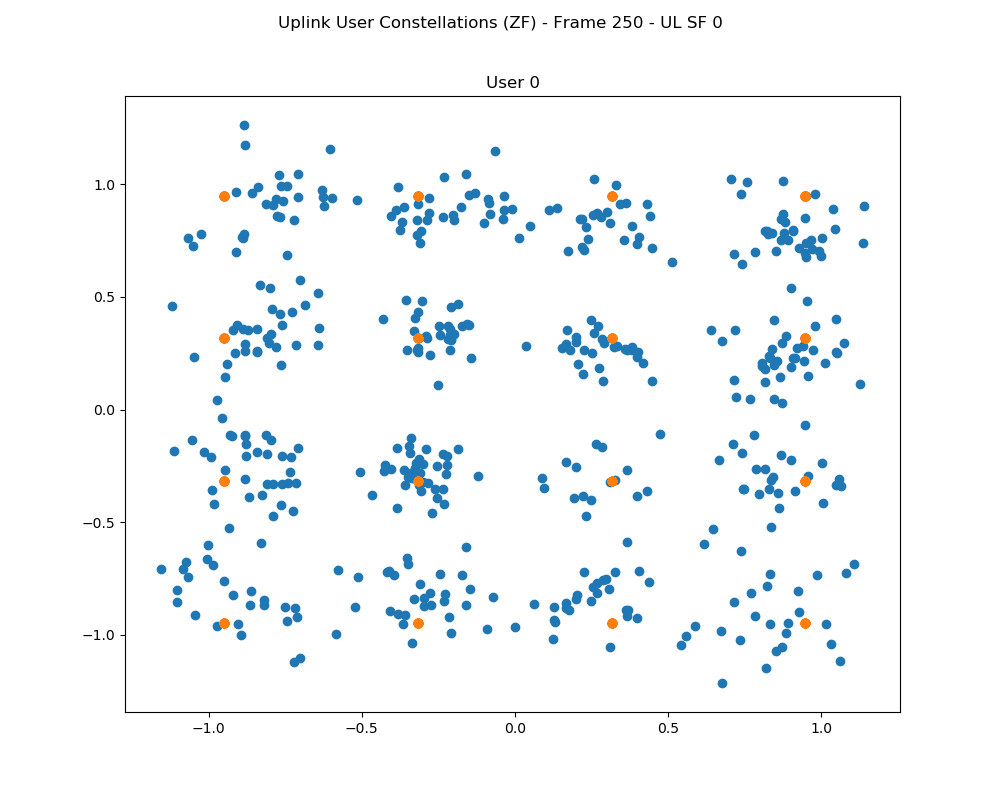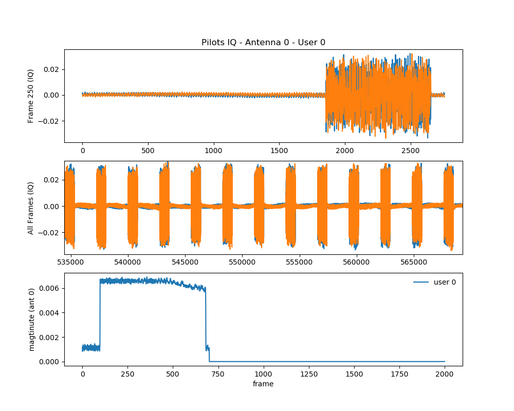 logs/trace-uplink-2022-7-8-7-43-59_1_8x1_0_7.hdf5), follow the Analyze the HDF5 dataset step here to analyze the results. For example, we can show the pilot and uplink IQ waveforms, Uplink User Constealltion along with its Error Vector Magnitude(EVM) and Symbol Error Rate(SER) values (in this case: EVM is 0.88%; SER is 1.45%]):root@node21-1:~/RENEWLab/PYTHON/IrisUtils# python3 plot_hdf5.py ../../CC/Sounder/logs/trace-uplink-2022-7-8-7-43-59_1_8x1_0_7.hdf5 --ref-frame=250 --signal-offset=1775 --demodulate zf