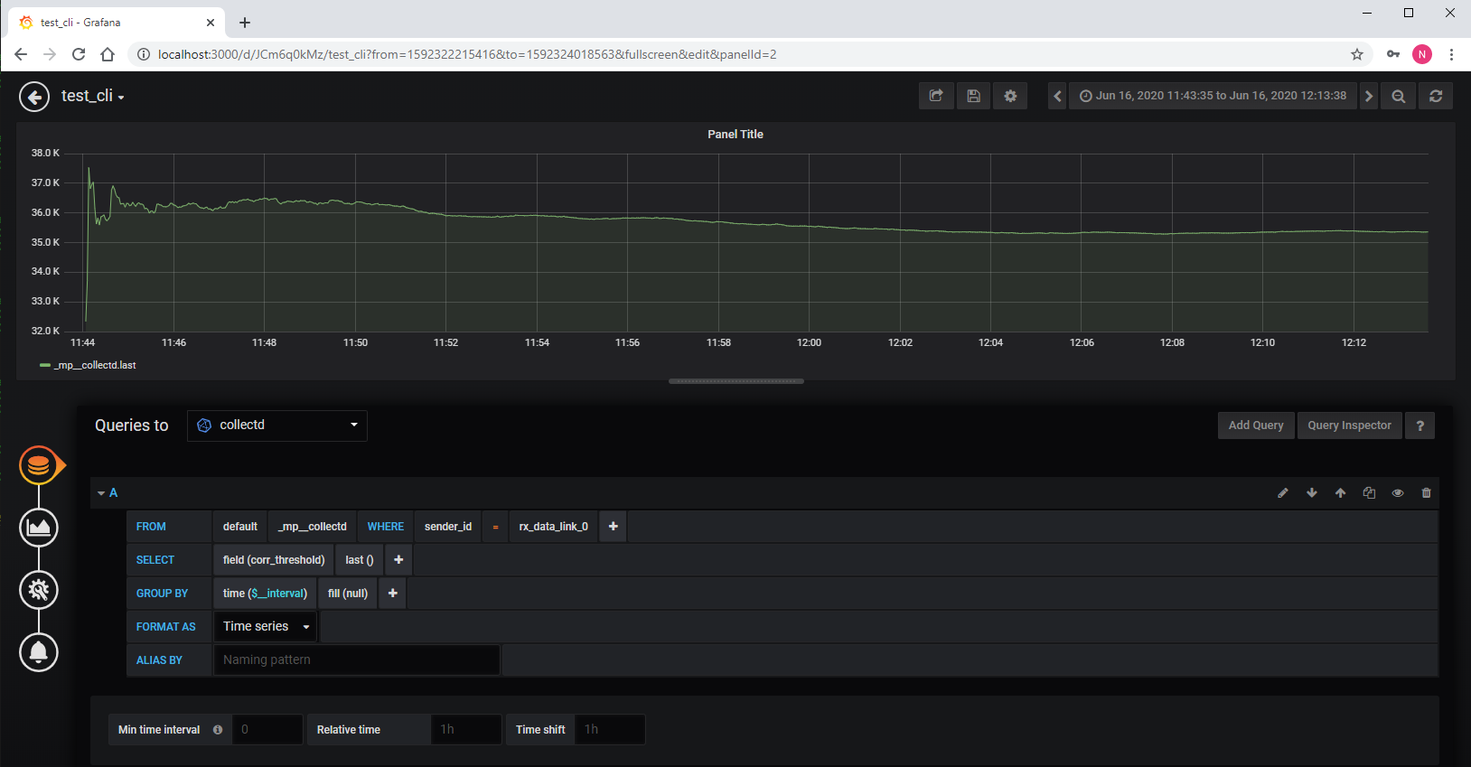 curl -XPOST 'http://idb2:8086/query?db=collectd&pretty=true' --data-binary 'q=select * from _mp__collectd' : "results": [ { "statement_id": 0, "series": [ { "name": "_mp__collectd", "columns": [ "time", "corr_threshold", "pkt_len", "sender_id", "seq_no", "seq_num", "time_stamp", "time_stamp_server" ], "values": [ [ "2020-06-16T15:44:04.310022857Z", 32221.601562, 7, "rx_data_link_0", "1", 1, "2.266386", "2.309666" ], : : : [ "2020-06-16T16:17:20.274931375Z", 35238.019531, 2, "rx_data_link_0", "2049", 205, "1998.270517", "1998.274432" ], [ "2020-06-16T16:17:21.276384485Z", 35233.40625, 63, "rx_data_link_0", "2050", 206, "1999.272047", "1999.276026" ], [ "2020-06-16T16:17:22.276512538Z", 35226.476562, 34, "rx_data_link_0", "2051", 207, "2000.272036", "2000.276081" ] :