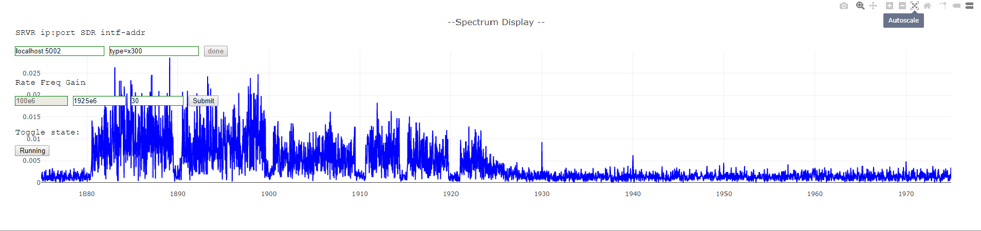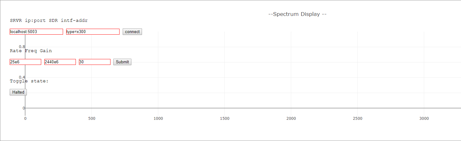 Now click on connect again to create a device handle. Finally click on submit to adjust the radio parameters and the Halted button to display a spectrogram.