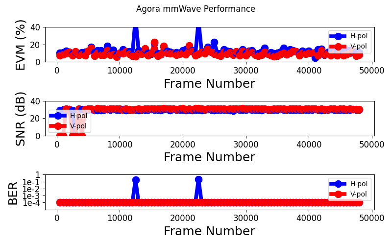 cubic_mimo.pyandcubic.py: This visualization tool helps to visualize the EVM, SNR, and BER readings for the Agora-UHD system.root@srv1-lg1:~/Cubic23/Agora/files/log/csv# taskset -c 33 python3 cubic_mimo.py