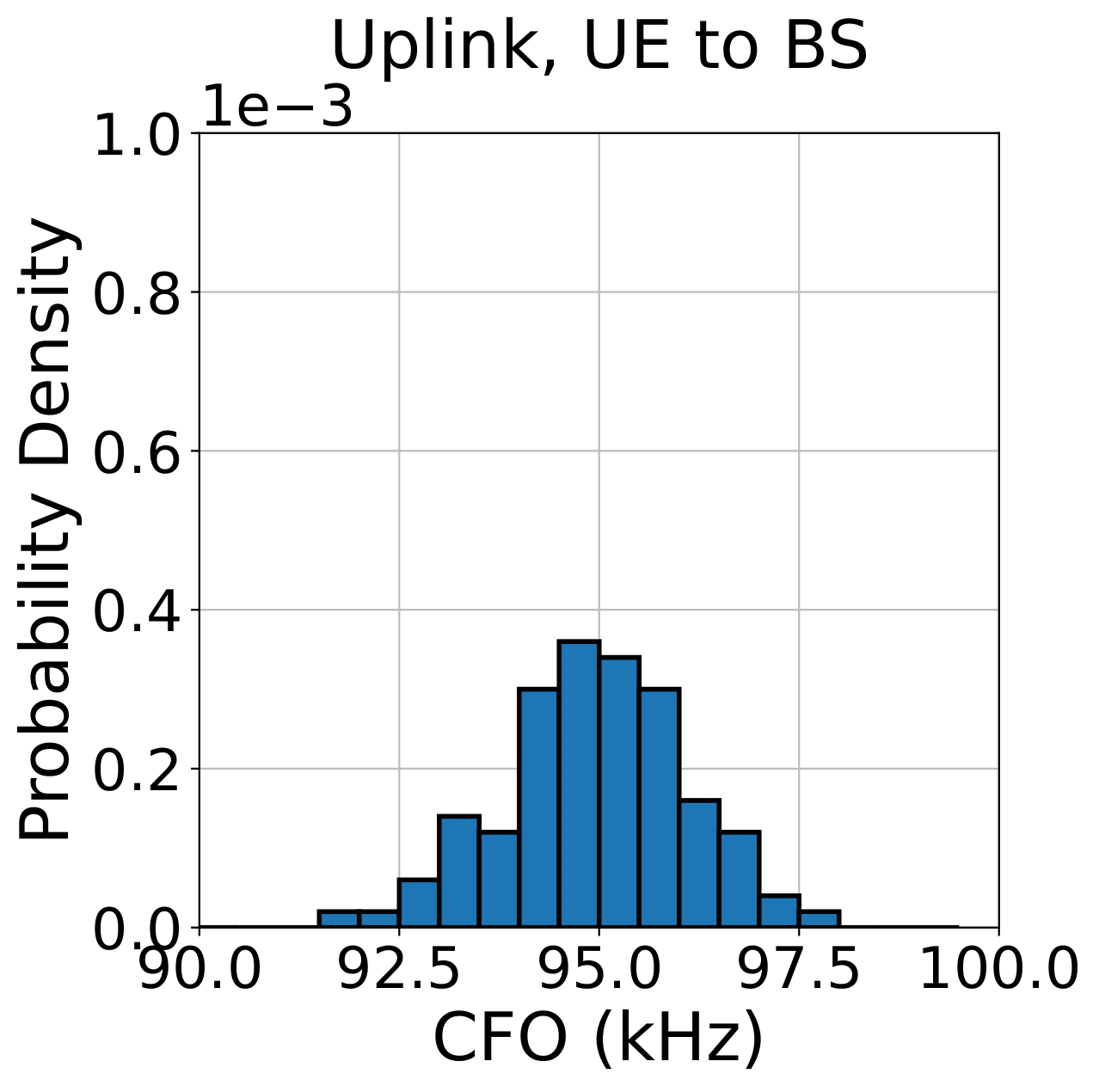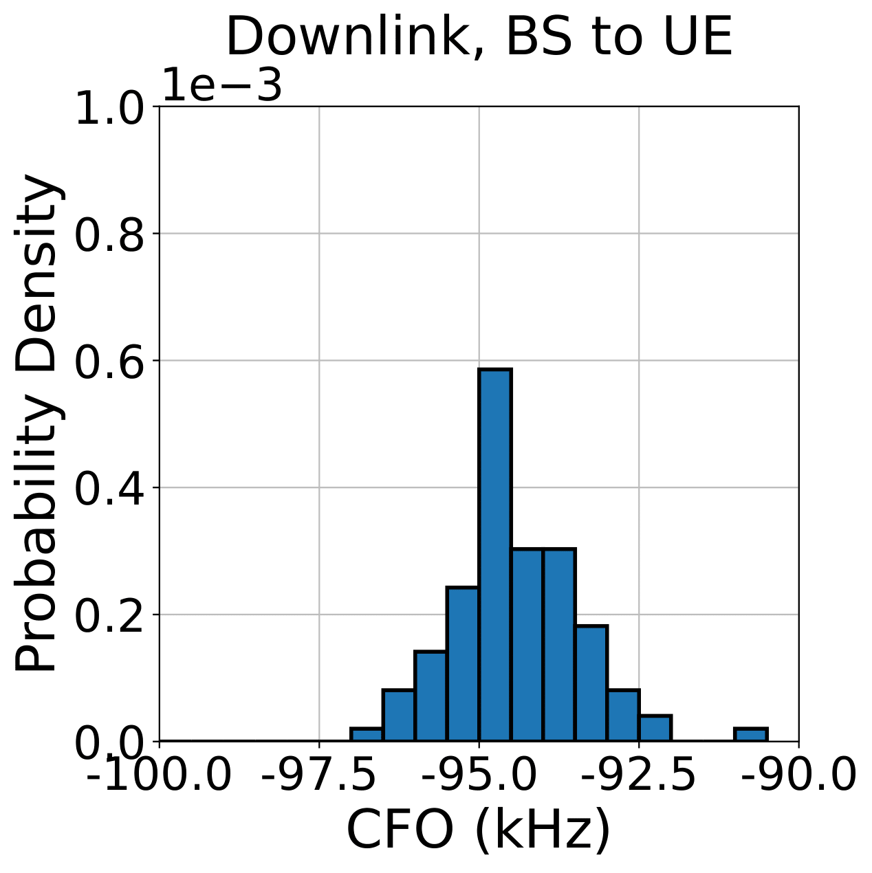 Based on the measurements we performed over 100+ times shown in the following probability density distributions of the estimated CFO values between the two PAAM boards, the CFO can be seen as a relatively constant value, hence, we pre-set the CFO to the PAAM board to be 97400