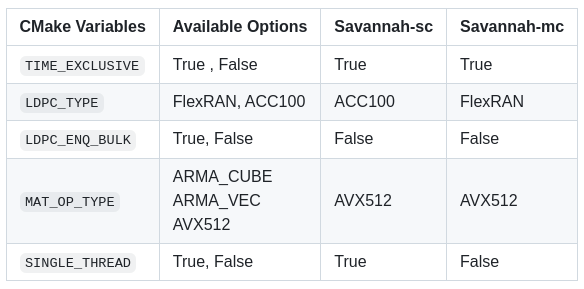 To run Savannah-sc, please update the CMake flag: LDPC_TYPE to be ACC100 and update the CMake flag: SINGLE_THREAD to be True.