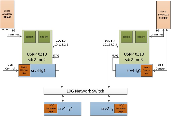 Sivers control software on srv1-in1, srv1-in2 talks to the mmWave front-ends over USB links. Host GNURadio applications on srv1-in1, srv1-in2, send/receive data samples to/from the X310s over 10G Ethernet links.