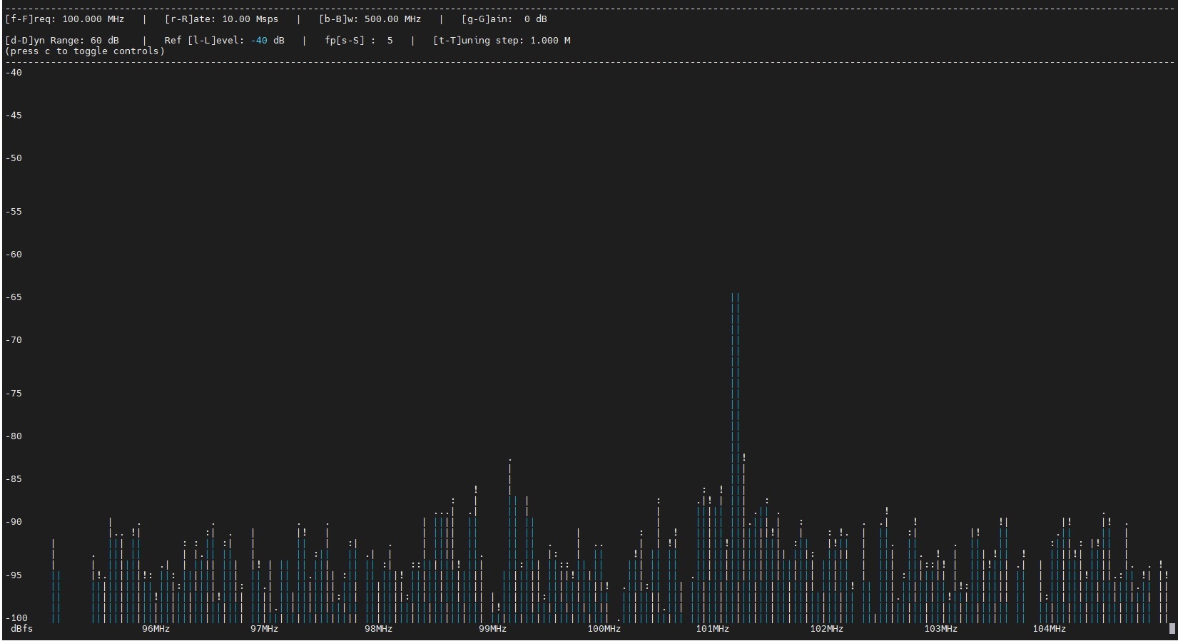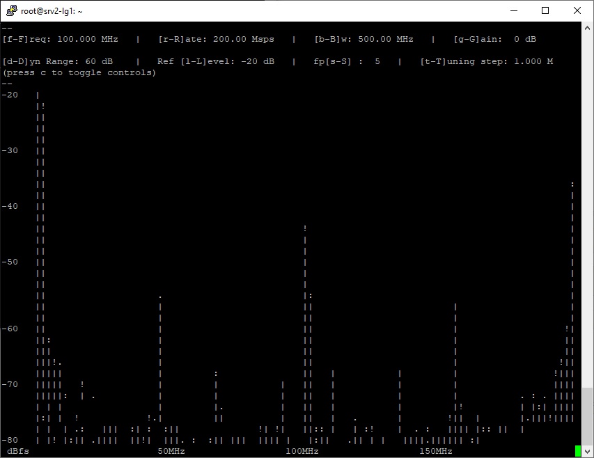 root@srv1-in2:~# /usr/lib/uhd/examples/rx_ascii_art_dft --args="addr=10.38.14.2" --freq 100e6 --rate 10e6 --ref-lvl -40 --ant AB --subdev B:AB