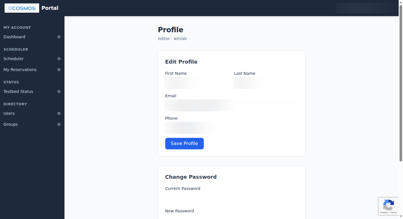 You can update your first name, last name, email address, and phone number. Changes take effect immediately and are reflected in LDAP (the testbed's directory service), so updated email addresses will be used for all future notifications.