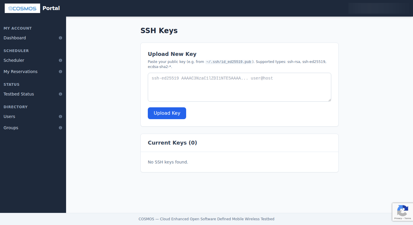 SSH keys are essential for accessing testbed nodes during your reservations. The portal lets you manage your public keys from SSH Keys (accessible via the top-right user menu).