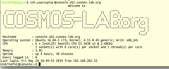 not_a_user@laptop:~$ ssh your_username@console.sb1.cosmos-lab.org Welcome to _____ ____ _____ __ __ ____ _____ _ ____ / ____/ __ \ / ____| \/ |/ __ \ / ____| | | /\ | _ \ | | | | | | (___ | \ / | | | | (___ _____| | / \ | |_) | ___ _ __ __ _ | | | | | |\___ \| |\/| | | | |\___ \_____| | / /\ \ | _ < / _ \| '__/ _` | | |___| |__| |____) | | | | |__| |____) | | |____ / ____ \| |_) | (_) | | | (_| | \_____\____/|_____/|_| |_|\____/|_____/ |______/_/ \_\____(_)___/|_| \__, | __/ | |___/ Hostname : console.sb1.cosmos-lab.org Operating system : Ubuntu 16.04.5 LTS; Kernel: 4.15.0-45-generic; Arch: x86_64; CPU : 6 x Intel(R) Xeon(R) CPU E5-2630 v2 @ 2.60GHz 1 socket(s) with 6 core(s) per socket and 1 thread(s) per core Memory : 3.9G Uptime : up 5 weeks, 1 day, 19 hours, 28 minutes Users logged in : 13 Last login: Thu May 16 10:18:10 2019 from 192.168.203.237 your_username@console:~$