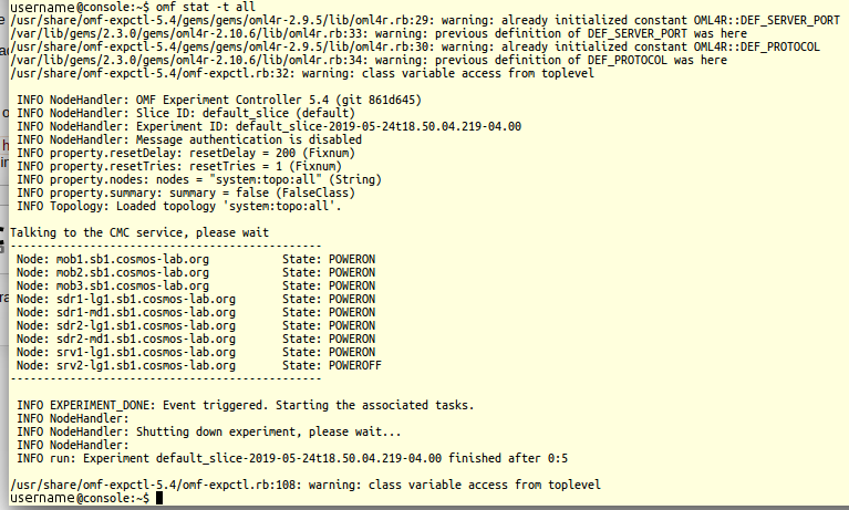 Once you are on the console, you can run "omf stat -t all" to look at the status of all the nodes that you can access from that console.